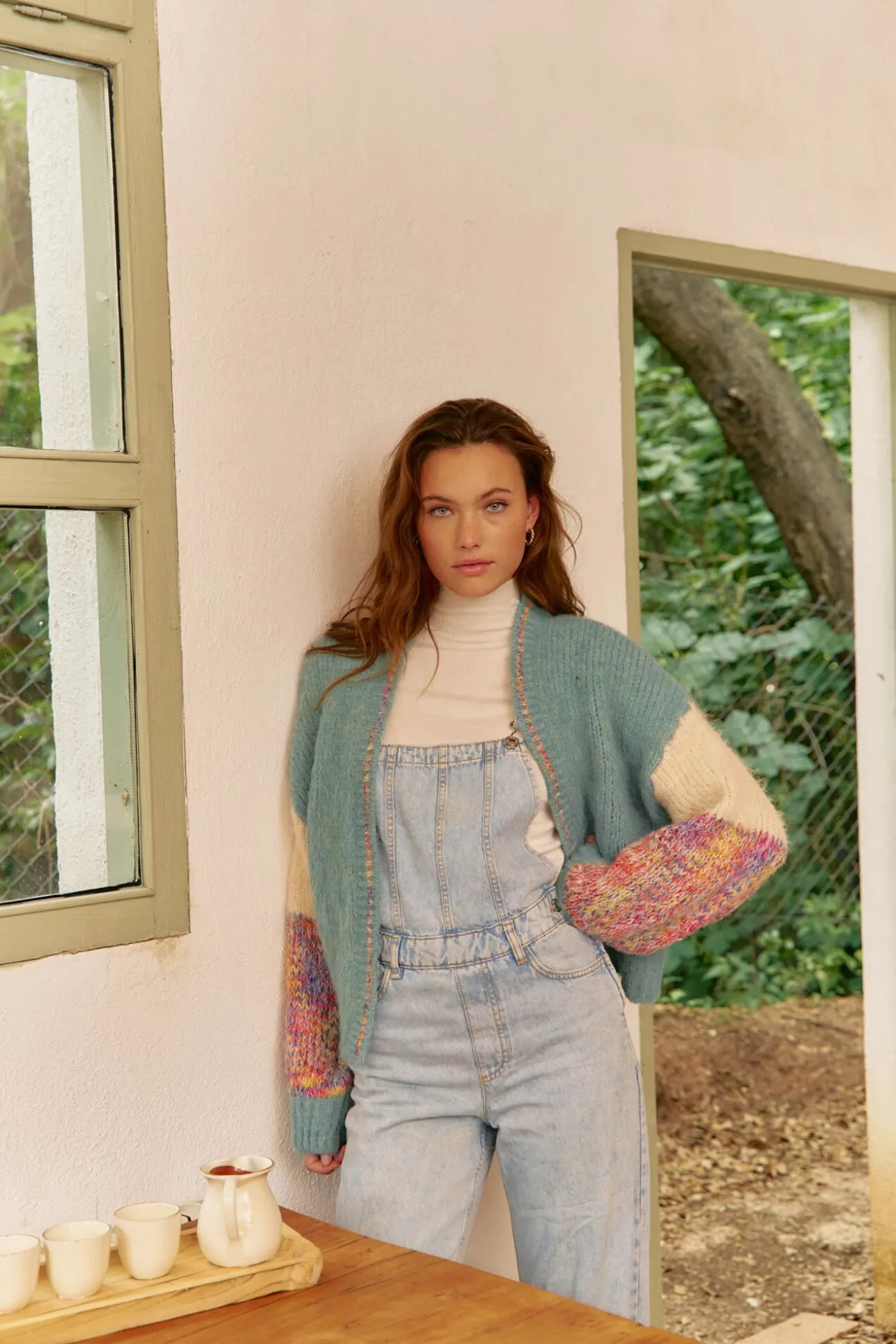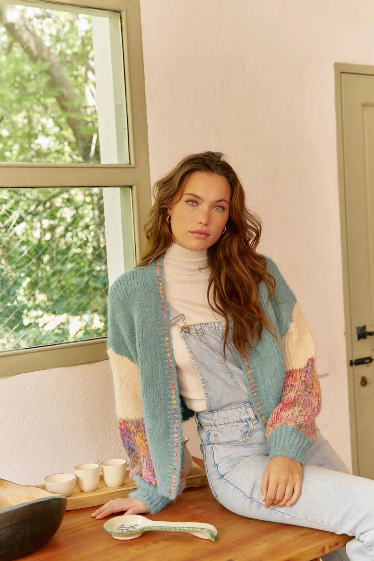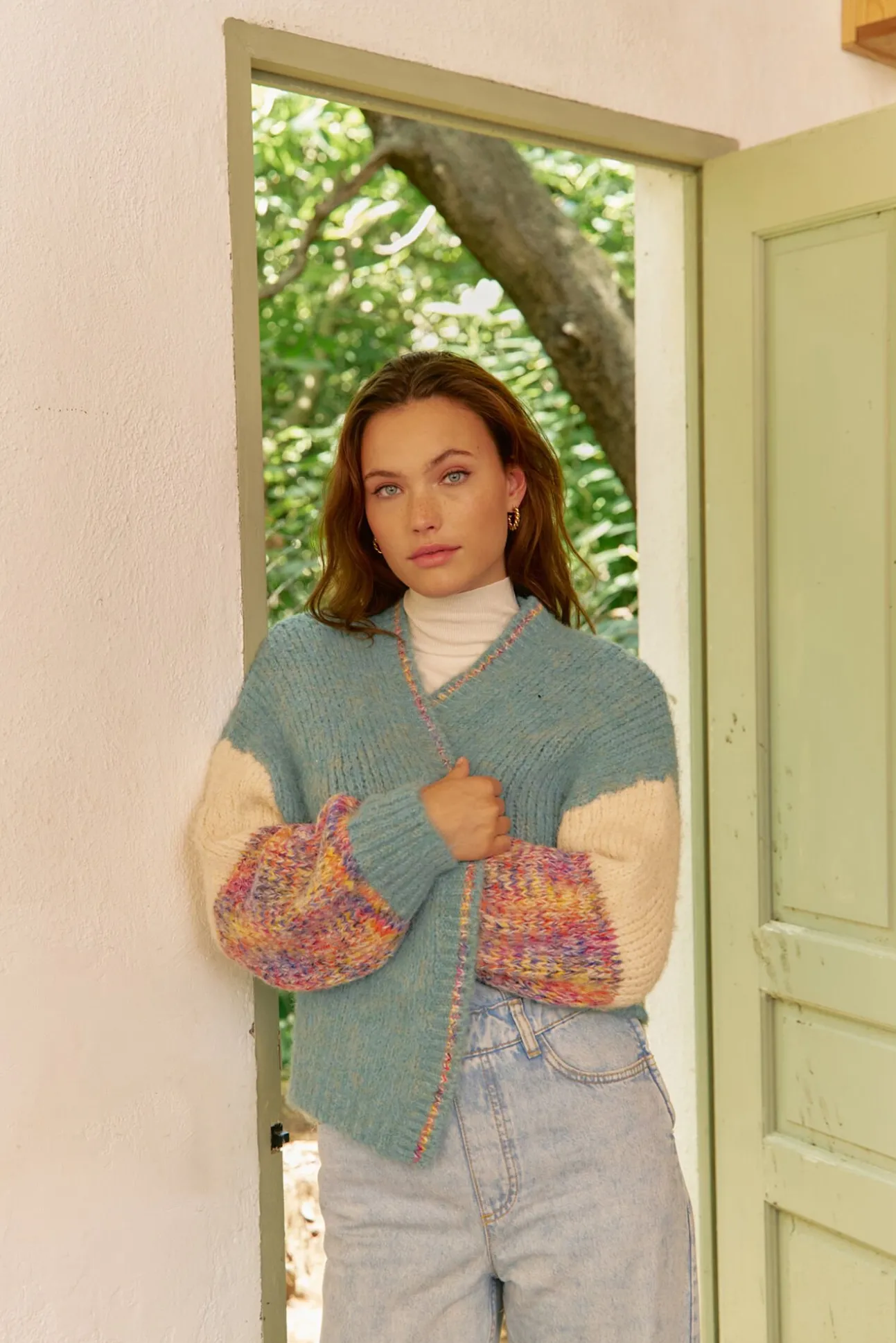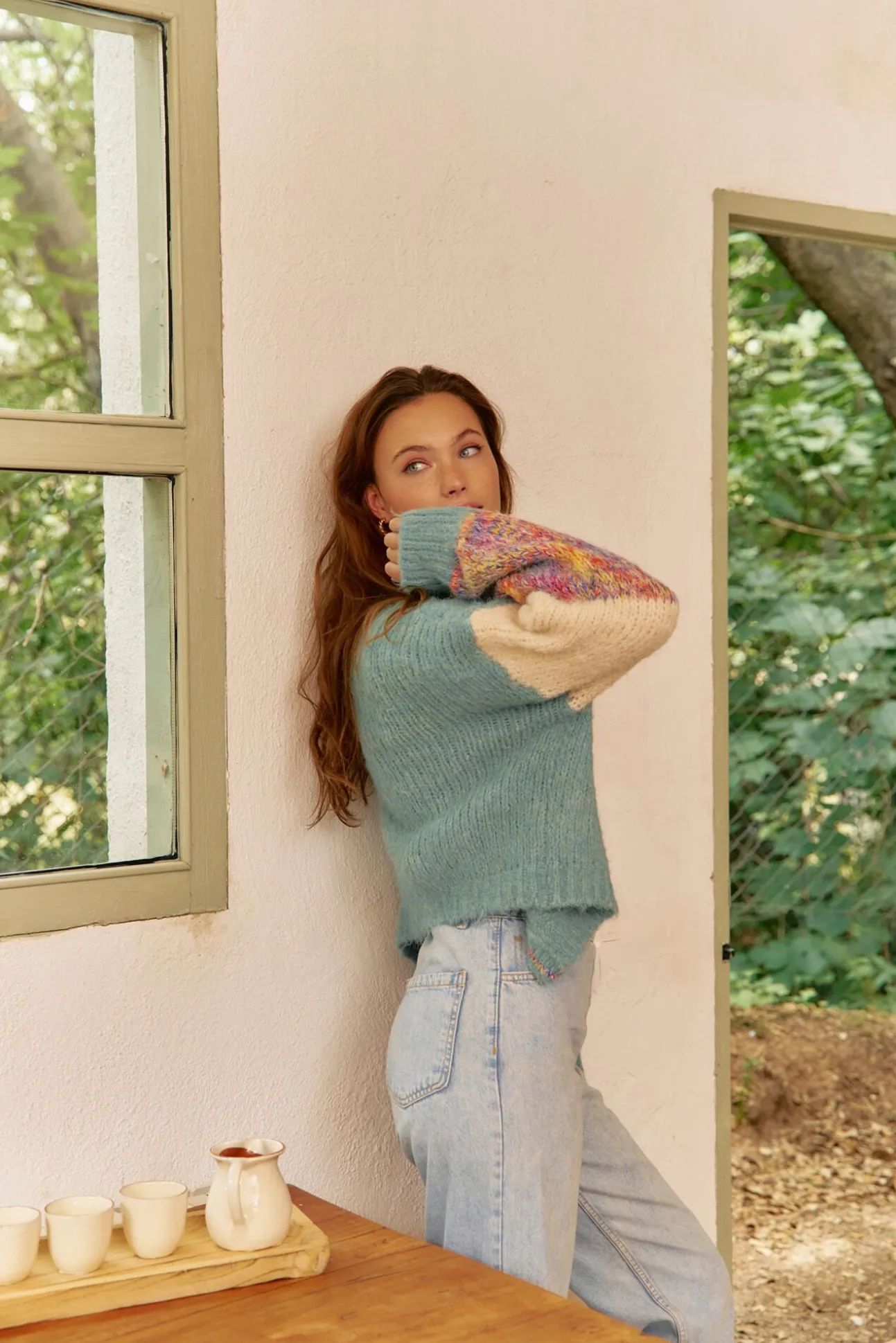 – Mangas coloridas abullonadas con hombro caído y puño ceñido