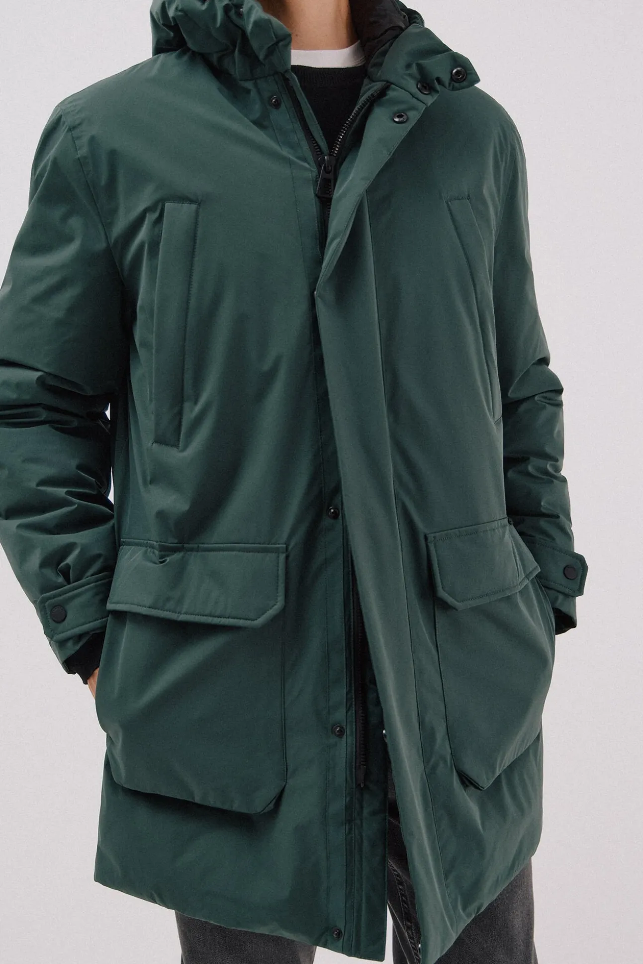 -Parka confeccionada en tejido técnico repelente al agua. Cuello alto con capcuha. Cierre delantero con botones de broche y cremallera. Puños con cierre broche. Dos bolsillos laterales de ribete en pecho y dos bolsillos bajos de plastrón. El relleno interior contiene fibra Thermolite.