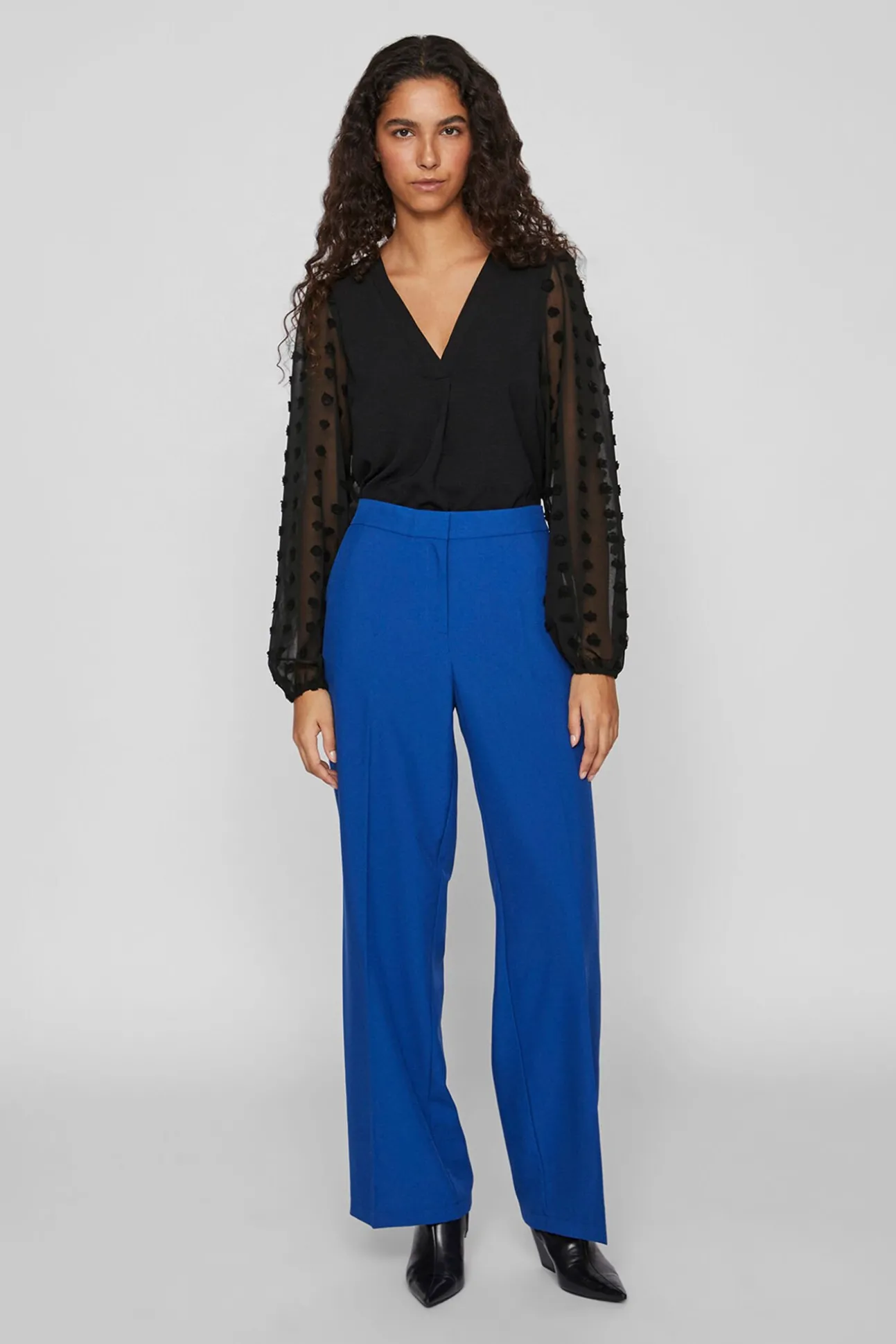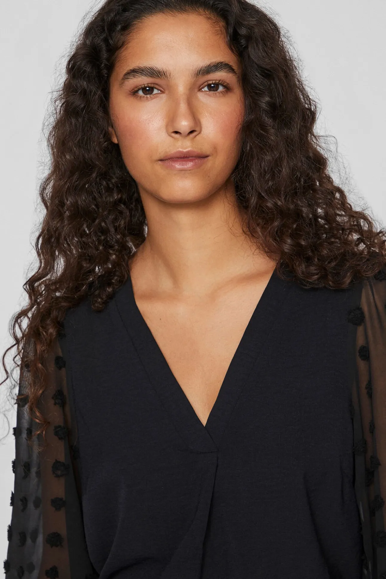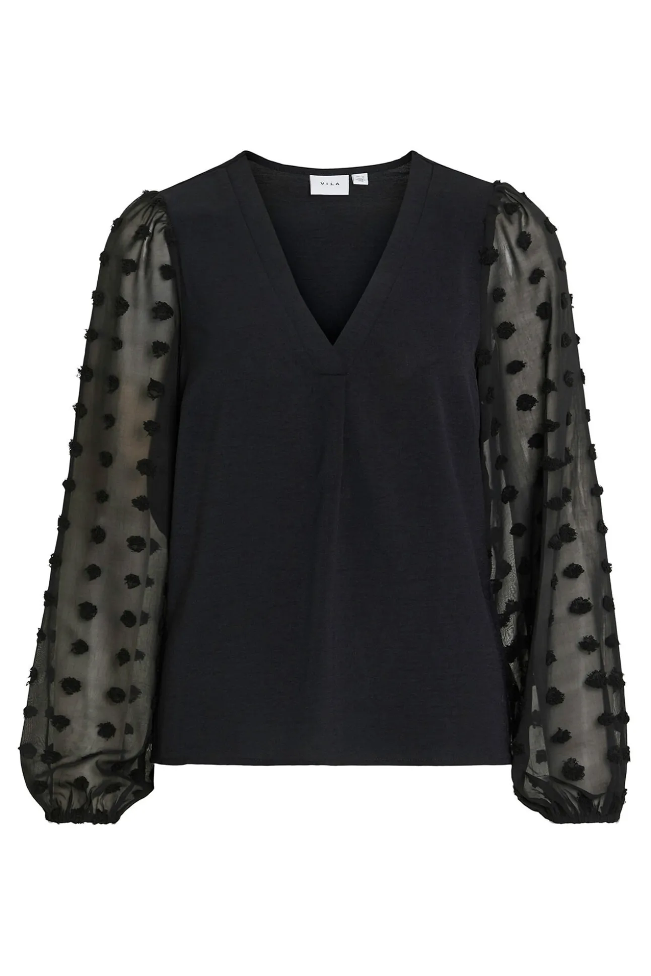 – Mangas semitransparentes, ligeramente abullonadas con elástico en puños