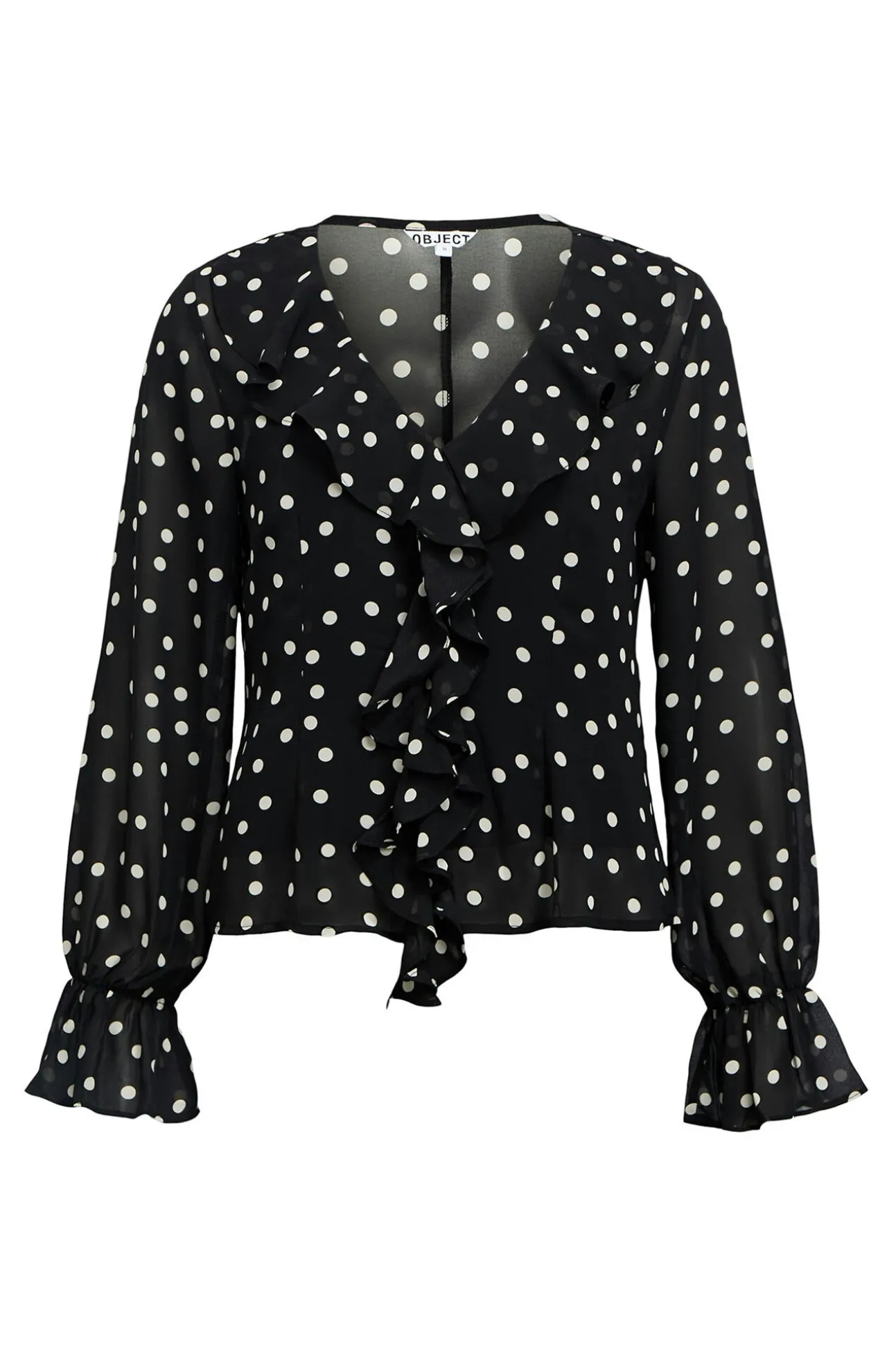 – Cuello en forma de V y volantes en escote