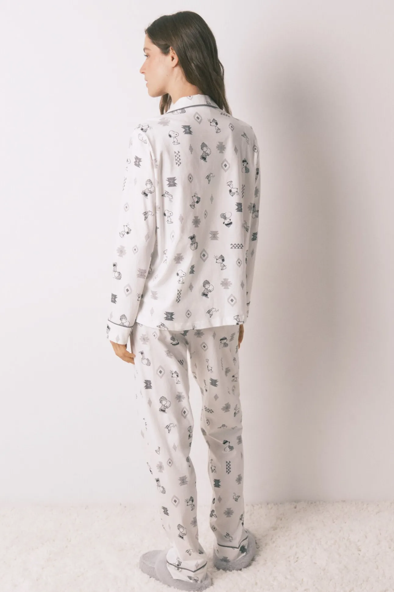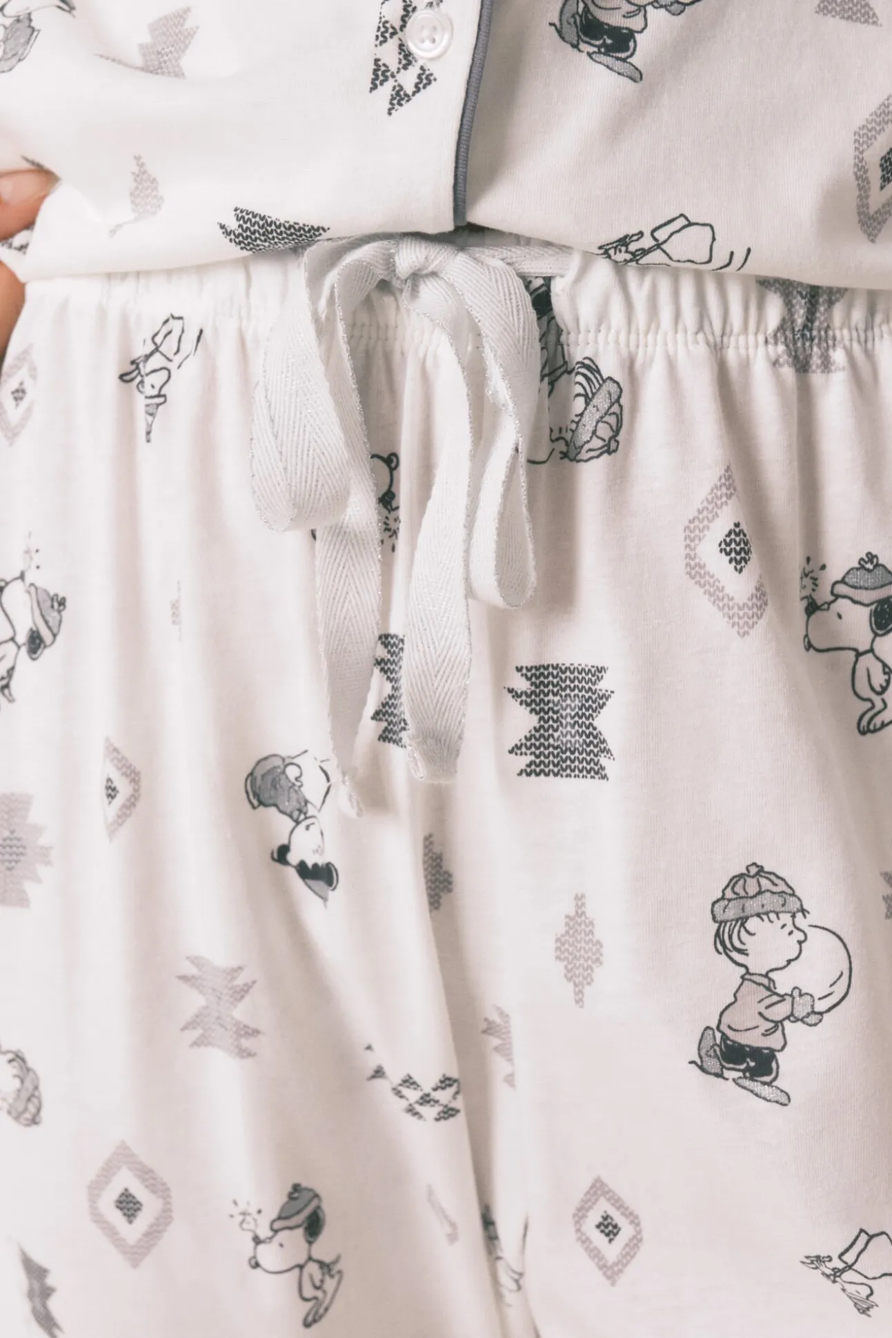 -Parte de arriba con cuello solapa, botones a tono, detalle de vivo a tono con el estampado y bolsillo en pecho. Pantalón con cinturilla elástica de jacquard a contraste.