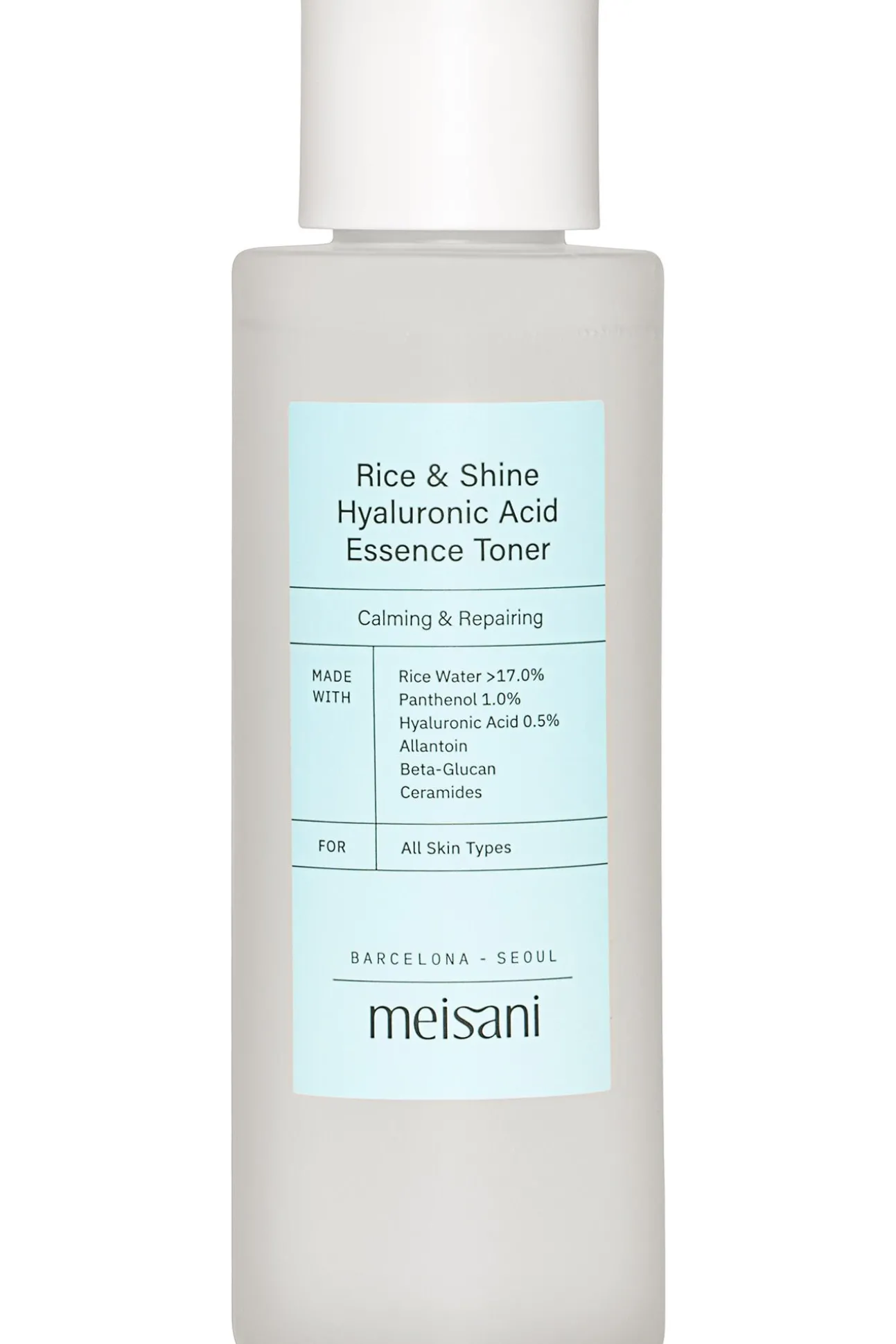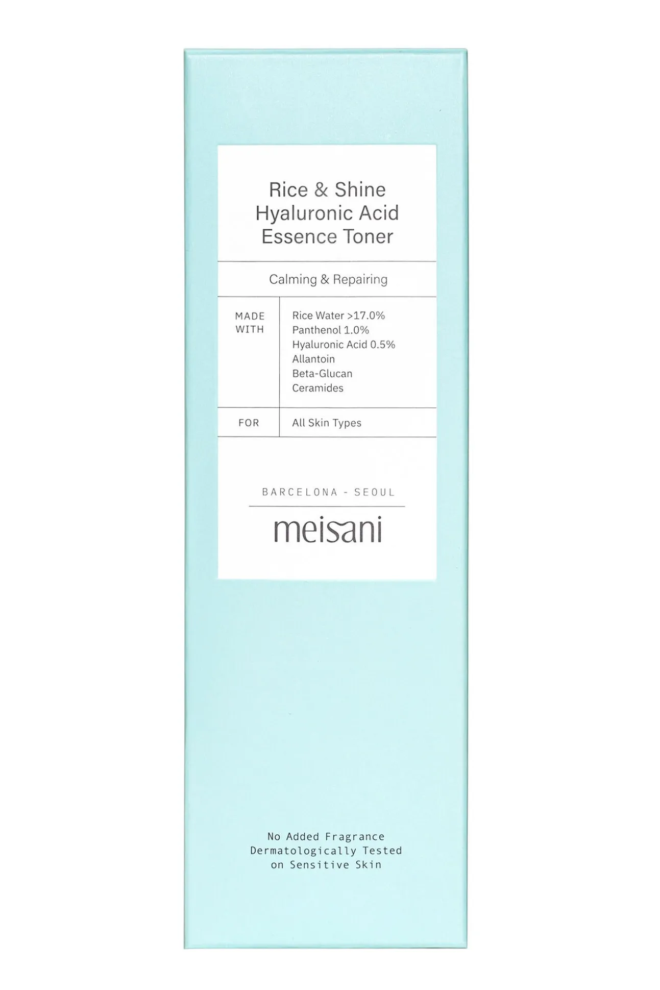 Aqua (Water/Eau), Oryza Sativa (Rice) Bran Water, Butylene Glycol, 1,2-Hexanediol, Glycerin, Panthenol, Methylpropanediol, Sodium Hyaluronate, Allantoin, Beta-Glucan, Ceramide NP, Pantolactone, Inulin Lauryl Carbamate, Hydrogenated Lecithin, Caprylic/Capric Triglyceride, Caprylyl Glycol, Betaine, Citric Acid, Sodium Phytate, Xanthan Gum, Ethylhexylglycerin.