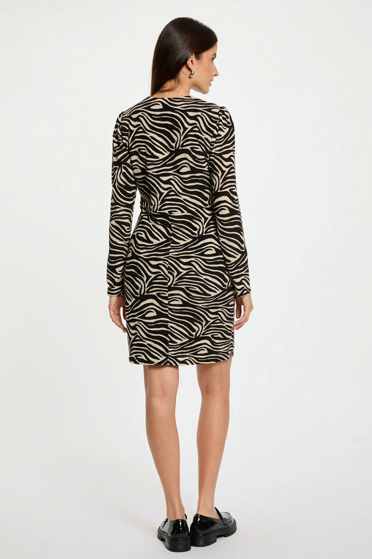 — El vestido recto entallado se combina con mocasines de charol y un par de pendientes para un estilo chic y afirmado.